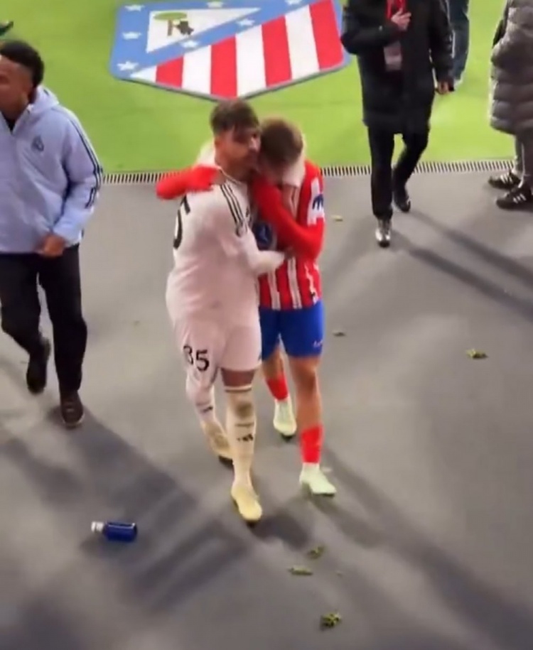 這時候,有鏡頭拍到了勞爾-阿森西奧與巴里奧斯相互擁抱退場,可見馬競中場在落敗后深受觸動,而皇馬后衛則給他送上了安慰和鼓勵。