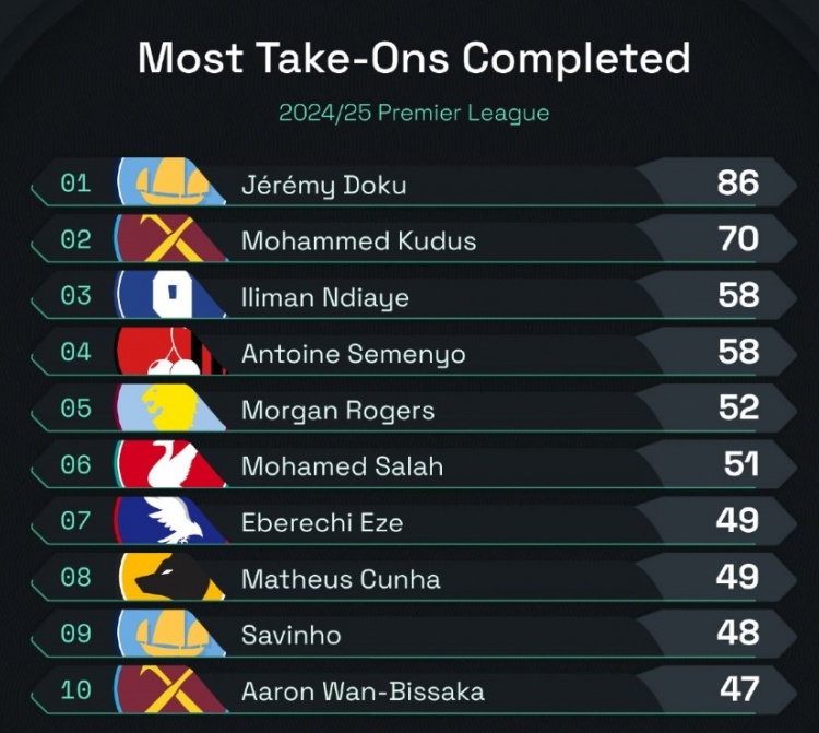 本賽季英超成功過人榜:多庫86次領跑,薩拉赫、薩維尼奧在列