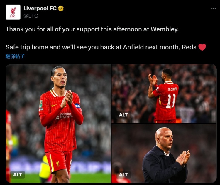 利物浦官推也在賽后感謝了球迷:“感謝你們今天下午在溫布利的支持。安全回家。紅軍們,我們下個月安菲爾德再見。”