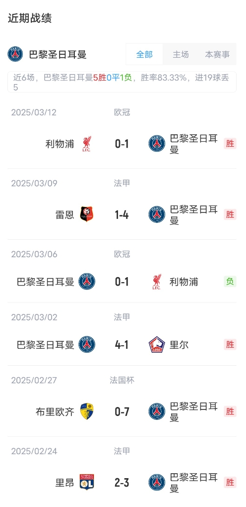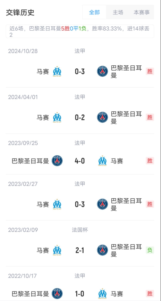 目前法甲聯賽巴黎取得了20勝5平的成績,積65分高居聯賽榜首。馬賽取得了15勝4平6負的成績,積49分位居聯賽第二。