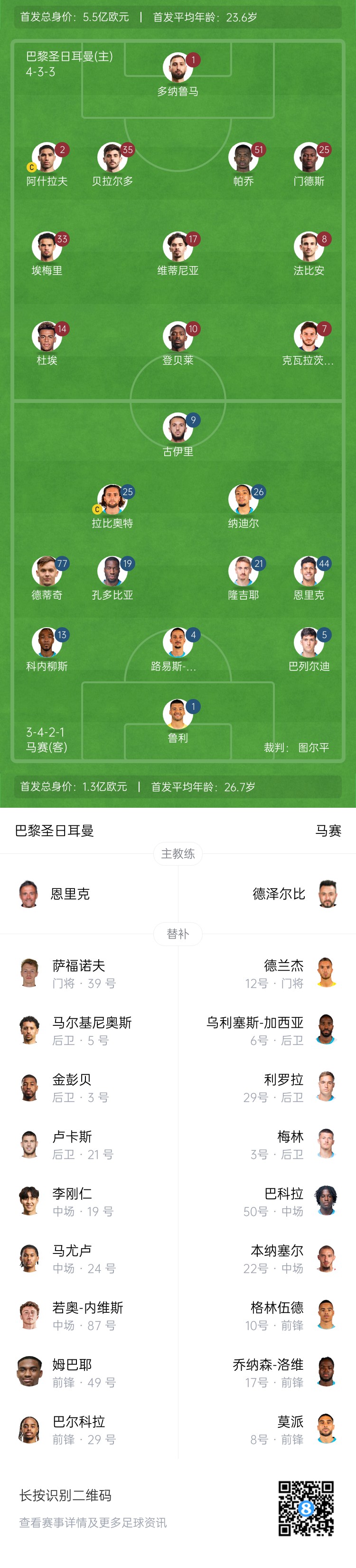 巴黎首發:1-多納魯馬、2-阿什拉夫、35-貝拉爾多、51-帕喬、25-努諾-門德斯、8-法比安、17-維蒂尼亞、33-扎伊爾-埃梅里、7-克瓦拉茨赫利亞、10-登貝萊、14-杜埃