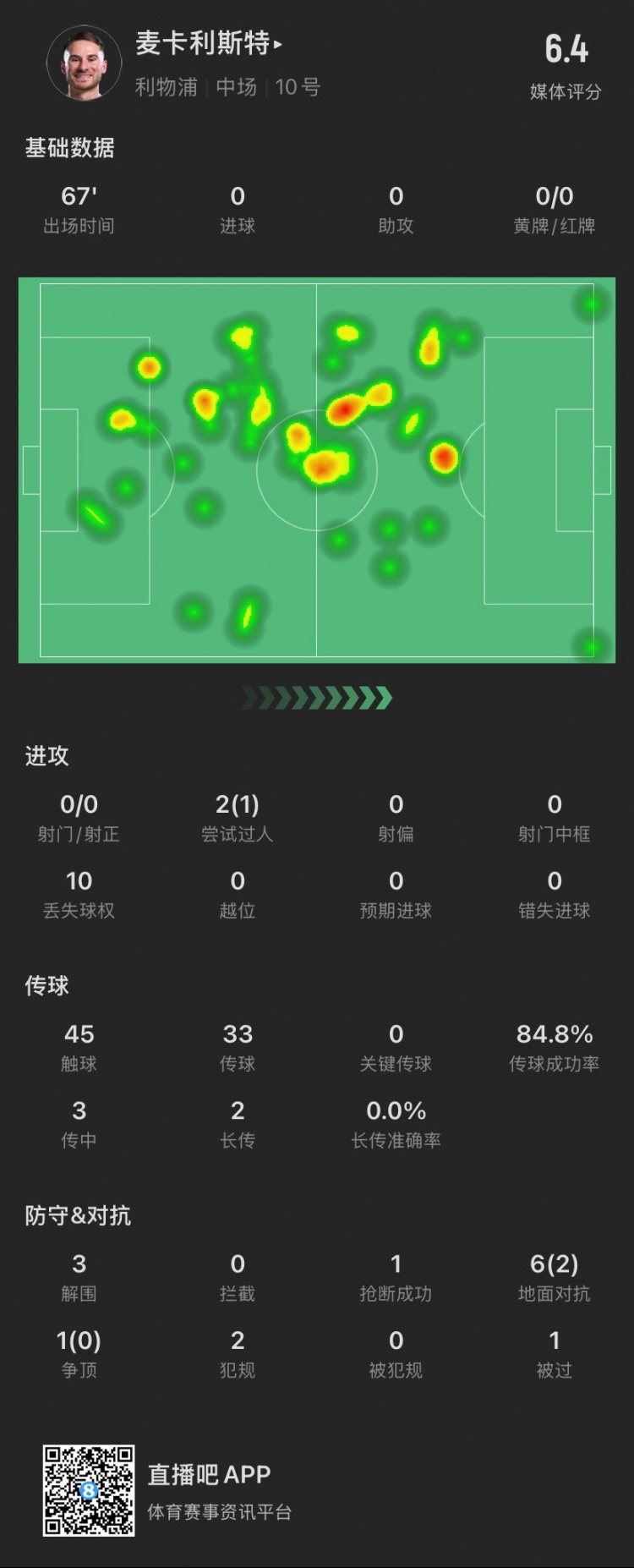 麥卡本場:7次對抗成功2次,貢獻3解圍1搶斷,2犯規,僅獲評6.4分