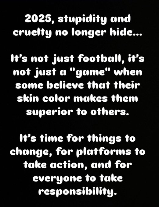 韋斯利-福法納寫道:“2025年,人們已經毫不掩飾自己的愚蠢和殘忍。當有人認為他們僅憑膚色就比別人更優越時,這不僅僅是足球的問題,這不僅僅是一個比賽的問題。”