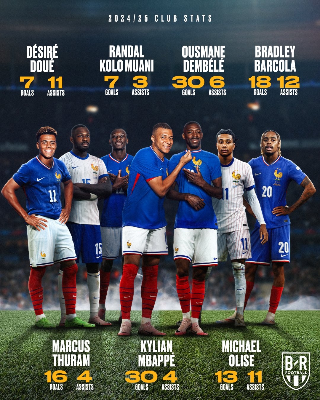 本賽季到目前為止,法國隊7名進攻球員(杜埃、穆阿尼、登貝萊、巴爾科拉、小圖拉姆、姆巴佩、奧利賽)的統計數據為: