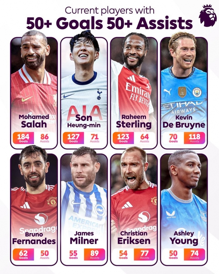 英超當前有8人進球助攻均50+:薩拉赫領(lǐng)銜,孫興慜、B費在列