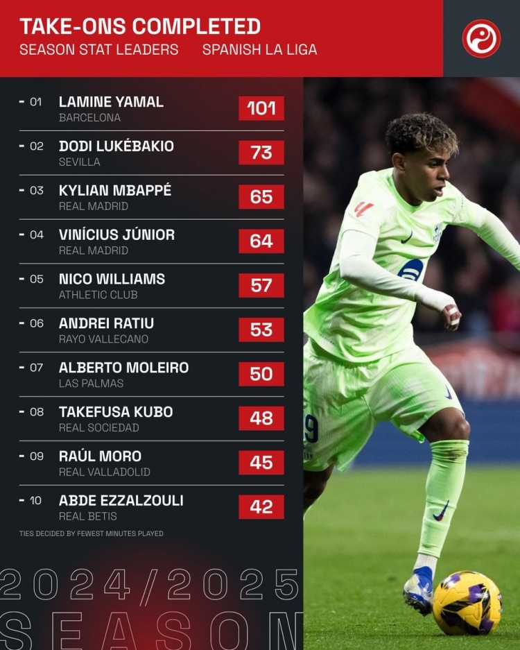 本賽季西甲成功過人榜:亞馬爾斷崖領跑,姆巴佩、維尼修斯在列