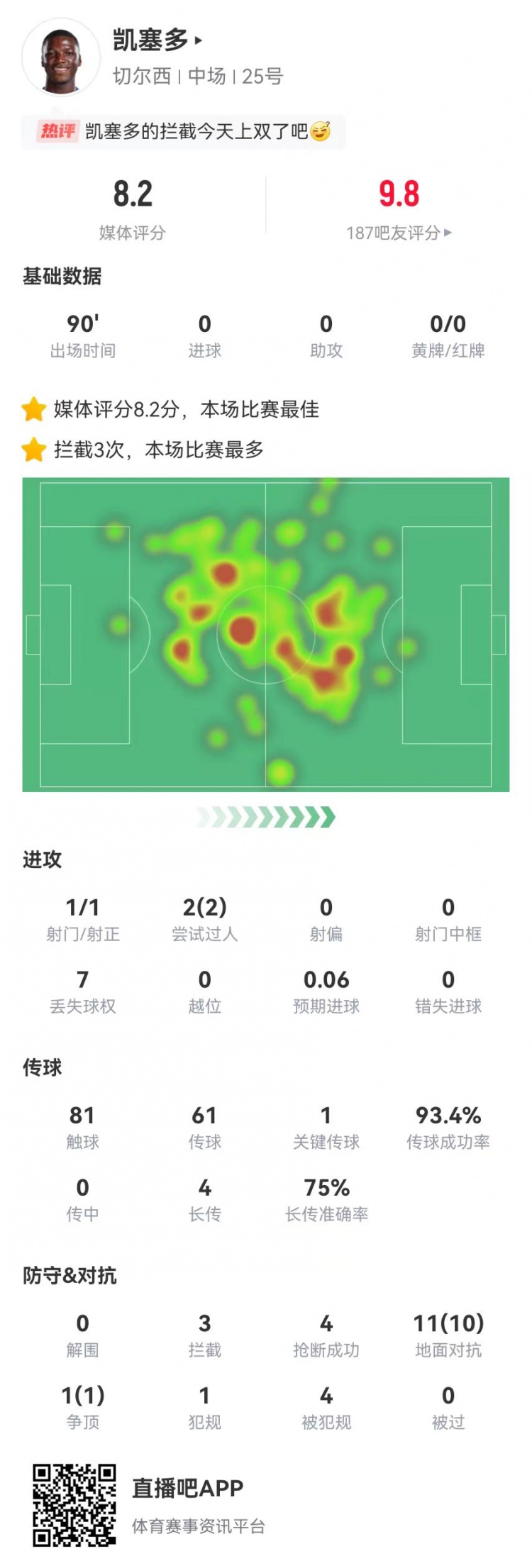 3月10日訊 切爾西在本輪英超1-0力克萊斯特城,凱塞多本場數據如下: