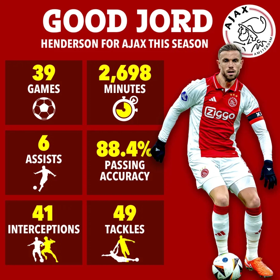 本賽季,喬丹-亨德森在阿賈克斯發揮不俗,他出戰39場比賽共計2698分鐘,貢獻6次助攻,傳球成功率88.4%,同時還有41次攔截和49次鏟搶。