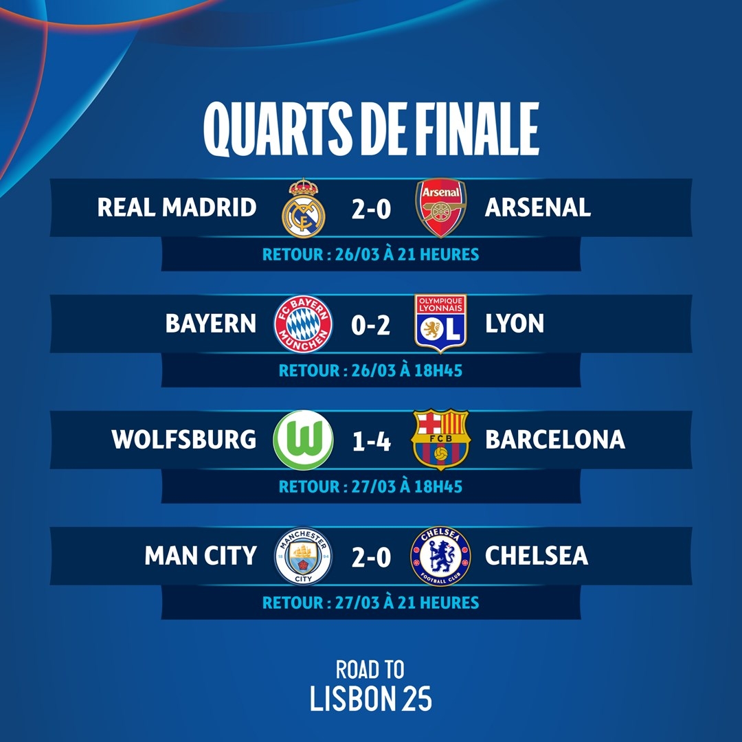 次回合比賽將于下周進(jìn)行,3月27號里昂女足對陣拜仁女足、阿森納女足對陣皇馬女足,28號巴薩女足對陣沃爾夫斯堡女足、切爾西女足對陣曼城女足。
