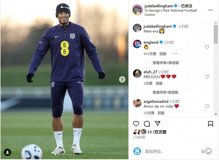 貝林厄姆隨英格蘭隊備戰世預賽,他在社交媒體上曬出訓練照片,并配文:“新時代????”