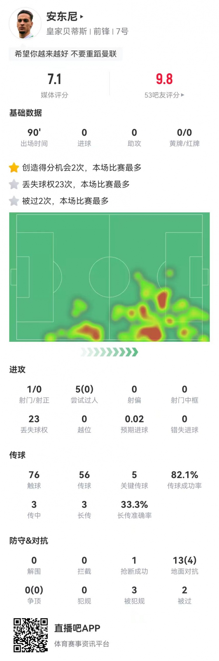 3月10日訊 貝蒂斯在本輪西甲1-0小勝拉斯帕爾馬斯,曼聯租將安東尼本場數據如下: