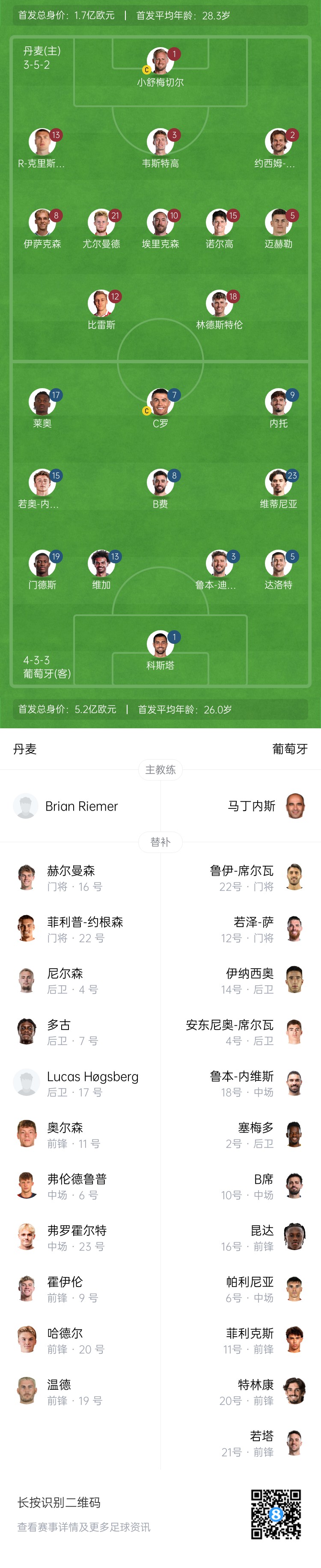 歐國聯-丹麥vs葡萄牙首發:C羅、萊奧、B費內托先發 埃里克森登場