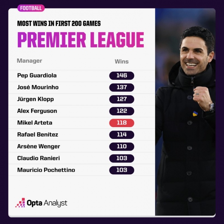 3月10日訊 阿森納在本輪英超焦點戰客場1-1戰平曼聯,阿爾特塔在個人執教英超200場里程碑未能獲得勝利。不過數據統計顯示,他仍然是英超歷史200場勝率第5高的主教練。