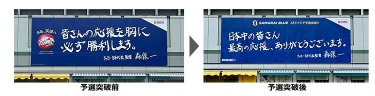 據日本足協報道,在日均人流量達300萬的日本新宿地鐵站南面出口的一處看板上,在世預賽前后都換上了森保一親筆寫下的感謝語。據悉,自3月16日到鎖定世界杯參賽資格前,看板內容為:“我們會將大家的聲援銘記在心,與巴林一戰我們一定會取勝。”