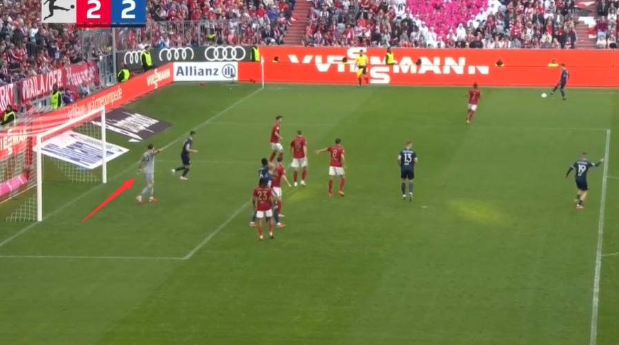 其中拜仁的第二粒丟球,在波鴻起傳中前,烏爾比希就指出了后點(diǎn)的防守隱患,但拜仁無人協(xié)防,博伊在面對波鴻傳中時冒頂,西索科將球頂進(jìn)球門遠(yuǎn)角。