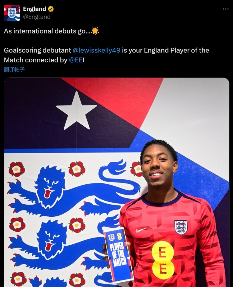 英格蘭隊官方也在賽后宣布,首秀破門的小將斯凱利被英格蘭球迷票選為本場比賽隊內最佳球員。