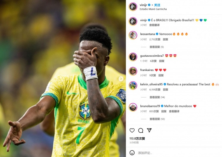 維尼修斯也在賽后通過社媒曬出自己的慶祝照,并配文:“這就是巴西!!!感謝巴西利亞!!!”