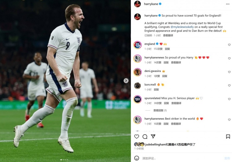 凱恩社媒曬照:自豪打進在英格蘭的第70球,祝賀斯凱利首秀破門