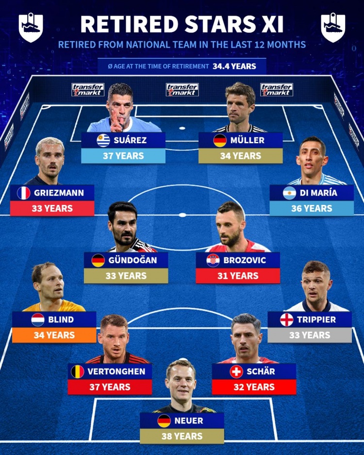 3月23日訊 德國轉會市場列出了近一年從國家隊退役的球星陣容,蘇亞雷斯、穆勒、格列茲曼、迪馬利亞、諾伊爾在列。