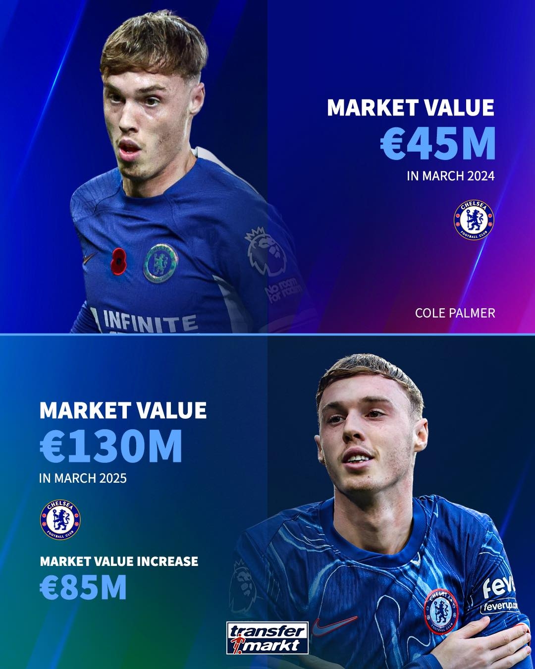 英超球員過去1年身價(jià)漲幅:帕爾默暴漲8500萬歐 馬爾穆什漲6000萬