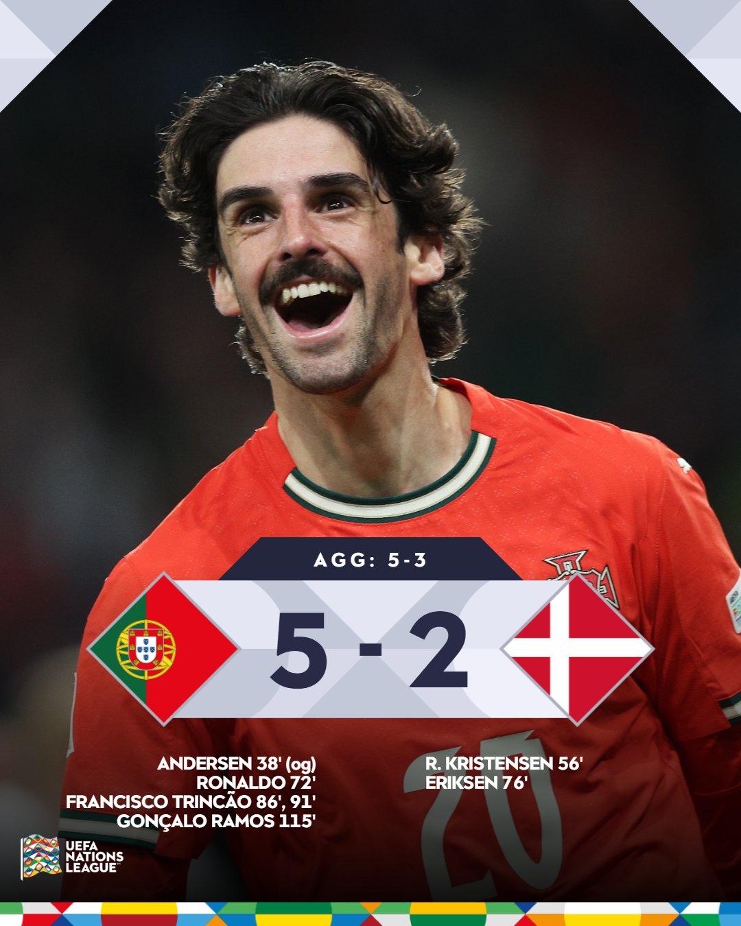 歐國(guó)聯(lián)八強(qiáng)戰(zhàn)次回合,葡萄牙5-2,總比分5-3戰(zhàn)勝丹麥,C羅失點(diǎn)+破門。
