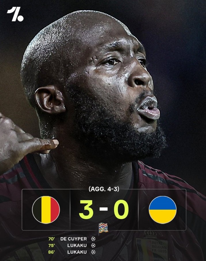 歐國(guó)聯(lián)升級(jí)賽次回合比利時(shí)3-0擊敗烏克蘭,盧卡庫(kù)梅開二度