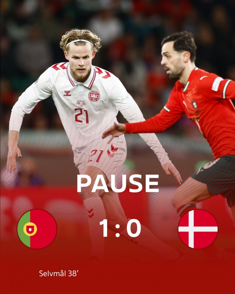 3月24日訊 北京時間3月24日03:45,歐國聯八強戰次回合葡萄牙迎戰丹麥的比賽在阿爾瓦拉德球場進行,上半場C羅開場造點+點射被撲,達洛特頭球造險,B費角球造安德森解圍自擺烏龍,半場結束,葡萄牙1-0丹麥。