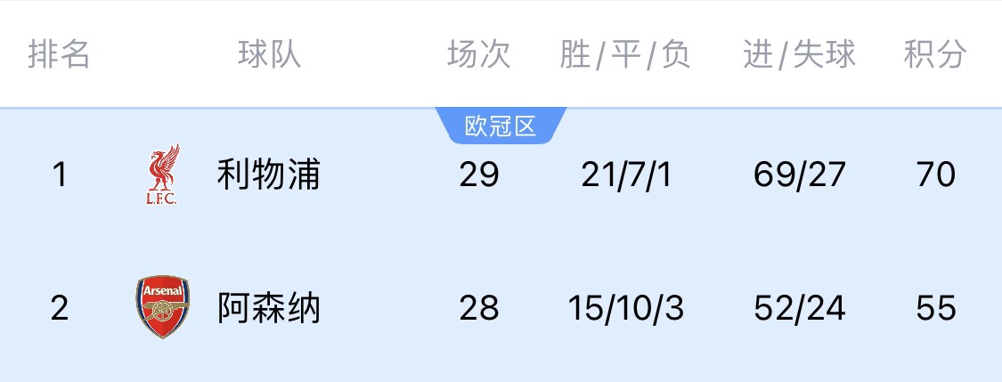 如果利物浦贏得接下來的兩場比賽,拿到76分;而阿森納恰好四連敗,即4月13日21:00利物浦主場迎戰(zhàn)西漢姆之前,紅軍已提前鎖定冠軍。