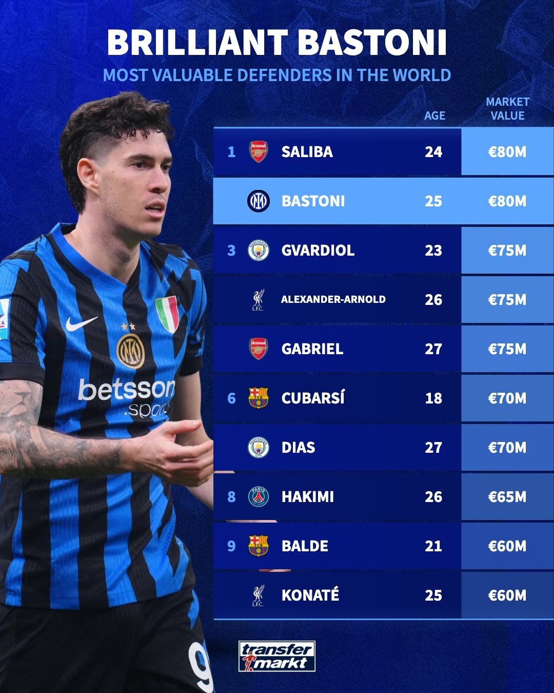 德轉最新后衛身價top10:巴斯托尼8000萬歐,與薩利巴并列第1