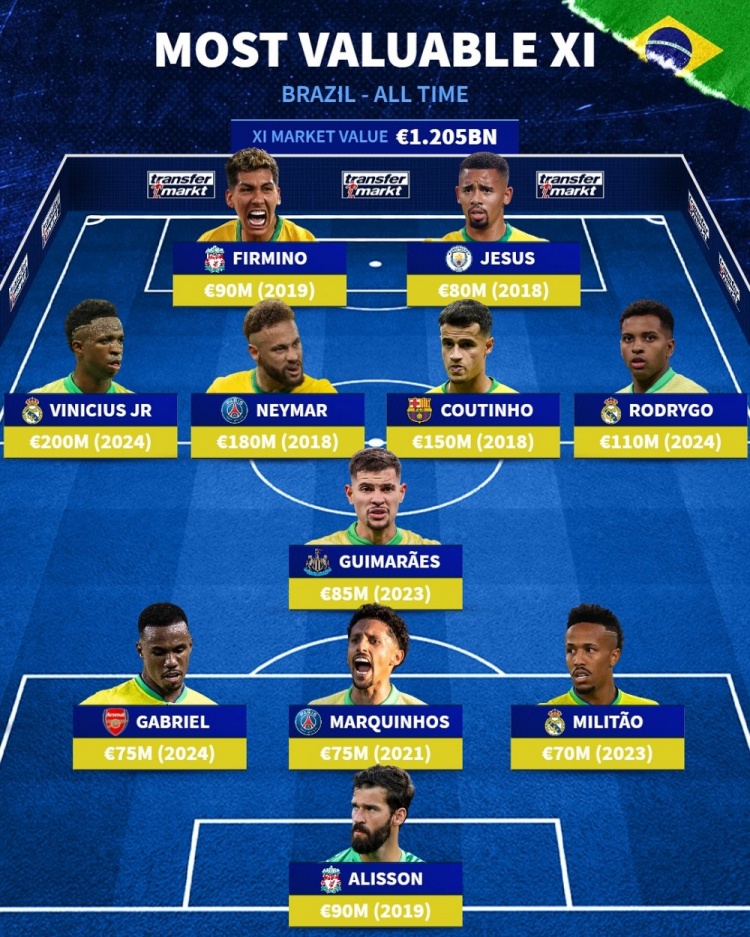 巴西歷史德轉身價最高陣:內馬爾、維尼修斯在列,總價12億歐