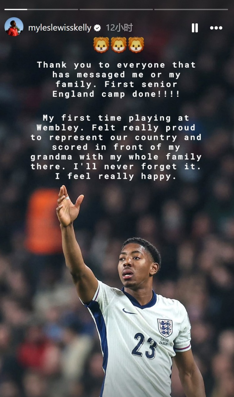 斯凱利寫道:“感謝所有為我和我的家人送上問候的人,首次英格蘭一線隊之旅結束了!!!這是我第一次在溫布利球場踢球。能為國出戰,并在奶奶和全家面前進球,我倍感驕傲。我永遠不會忘記,也感到非常開心。”