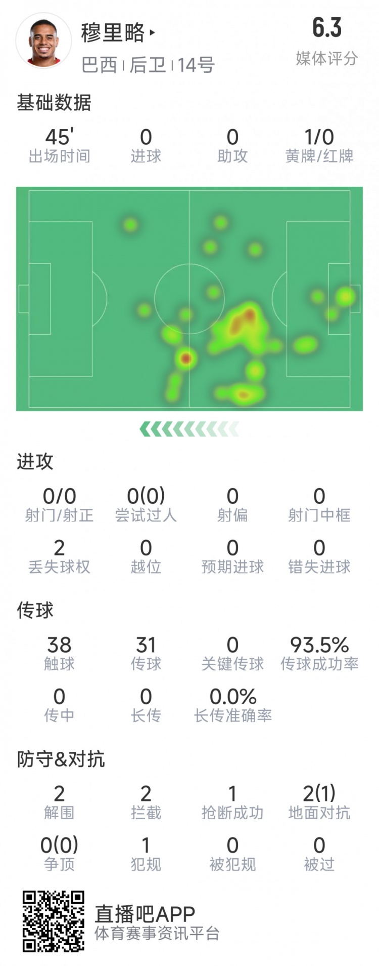 半場被換下,穆里略本場數據:兩次烏龍助攻,2解圍&2攔截