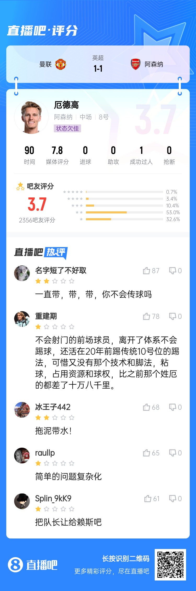 英超第28輪,阿森納客場1-1戰平曼聯。厄德高本場比賽首發踢滿全場,發揮糟糕。