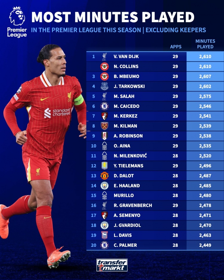 本賽季英超球員出場時間排行榜↓(不統計門將)