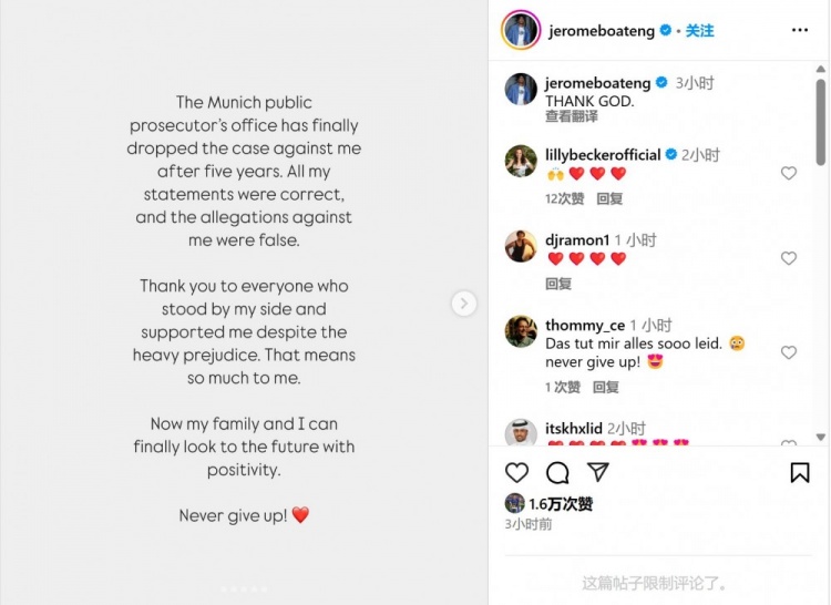 3月27日訊 博阿滕更新社媒,慶賀針對他的家暴指控被撤銷。