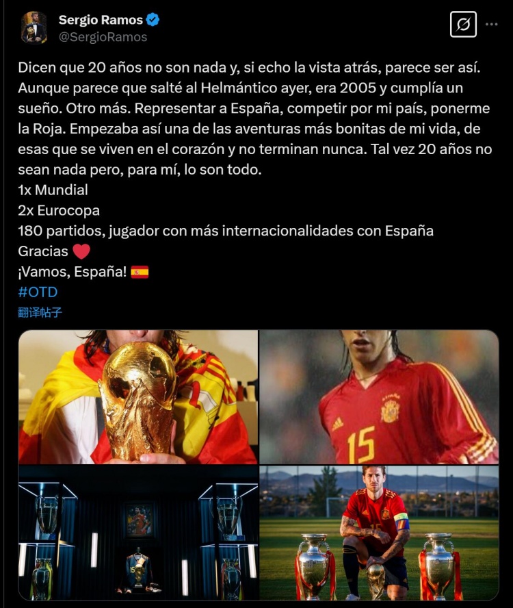 拉莫斯更新社媒,慶祝他代表西班牙國(guó)家隊(duì)首秀20周年