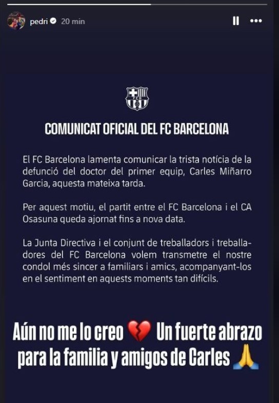 在消息出來后,許多巴薩球員都在社交媒體上悼念了卡萊斯,佩德里轉發了訃告并寫道:“我仍然不敢相信這是真的,給卡萊斯的家人一個大大的擁抱。”